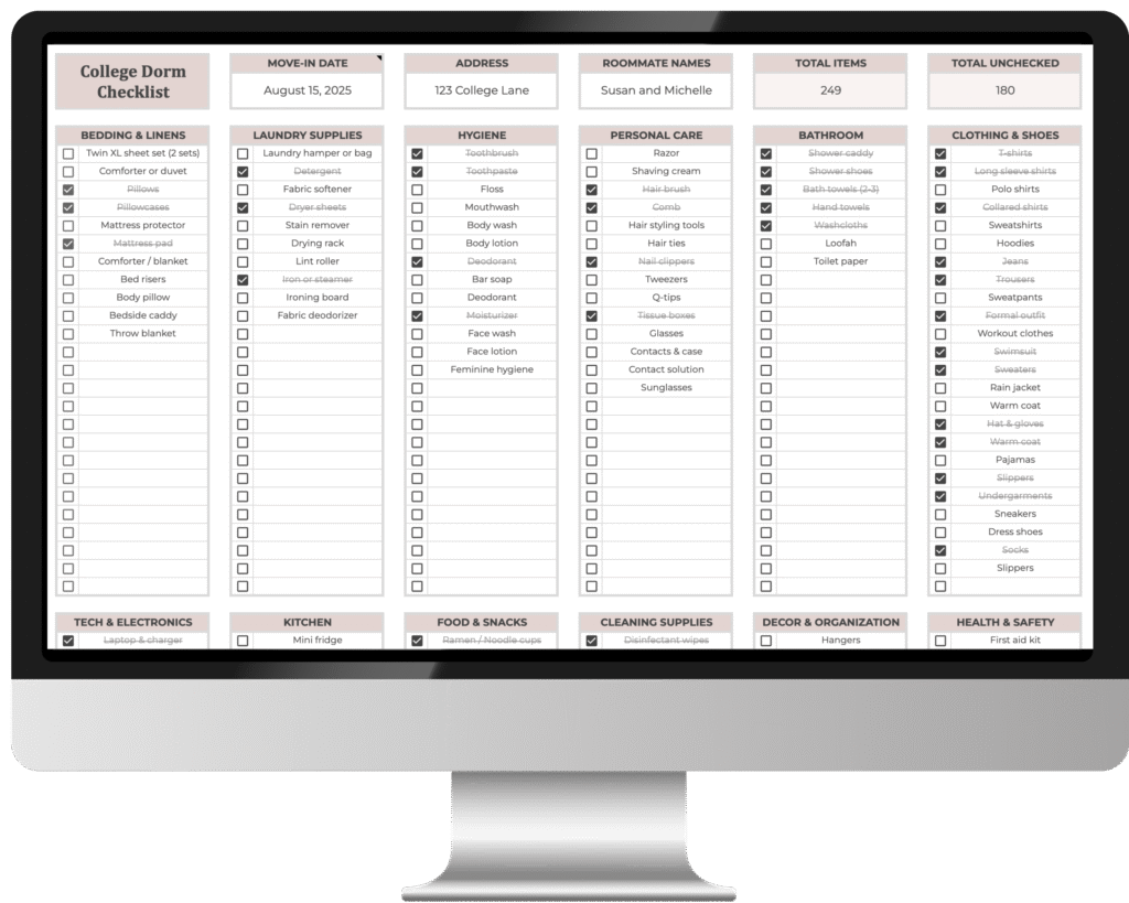 COLLEGE DORM CHECKLIST SPREADSHEET